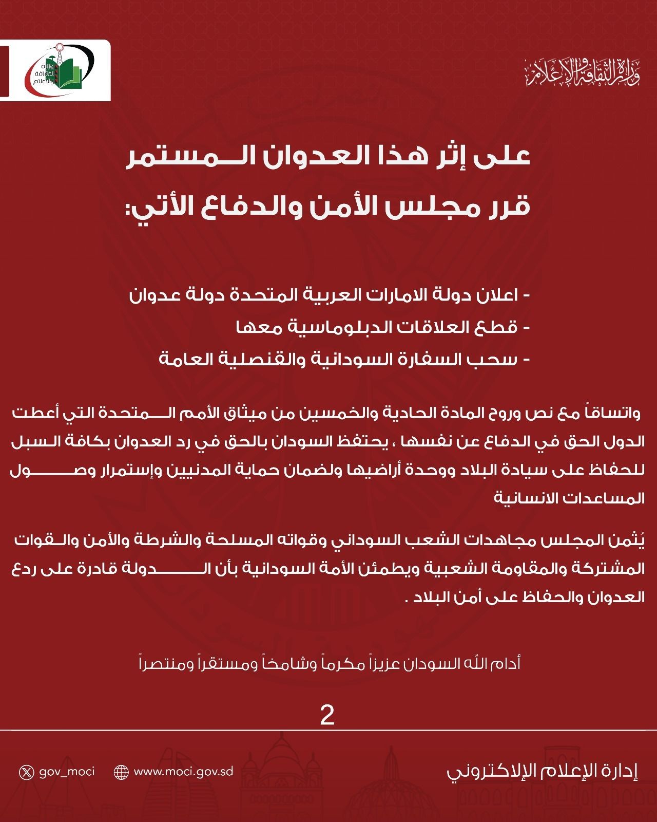 2- قطع كل العلاقات الدبلوماسية بين جمهورية السودان و الامارات العربية المتحدة
